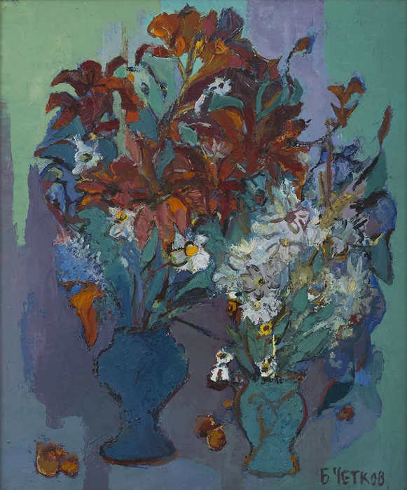 The art critic and historian Alexander Borovsky and author of Chetkov: Portraitist and Boris Chetkov: Across all Barriers assigns Chetkov’s still lifes to two broad categories. He suggests that paintings such as Still Life with Gladiolas, 1998 and Still Life, Steel Colossus seem to be exploring the notion of demiurge or form-creation whilst Still Life with Tulips, 2006, Still Life with Lilies, 1997 and Still Life-Asters in Blue Vase, 2003 are anchored more in the mimetic tradition, stating, “Coloring the artist’s work are questions of ‘form-creation’ as ‘demiurge’… and the direct relationship between the real and the created, the ‘mimetic’ approach.”