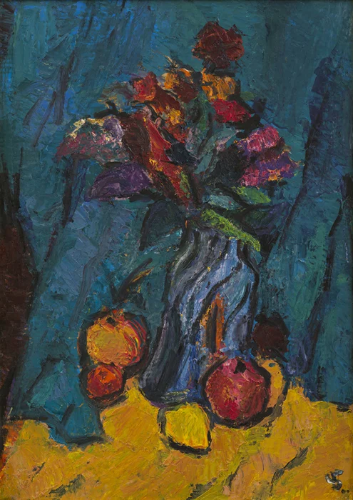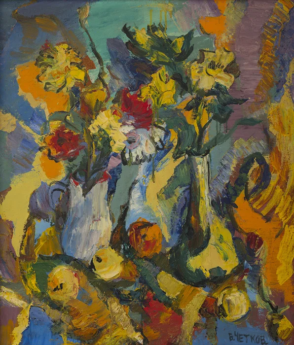 Chetkov began painting during an era when Soviet Russia was in the grip of Socialist Realism and all connection to Europe’s fast evolving tradition of art was severed. Somehow Chetkov not only succeeded in finding a career that could accommodate his abundant creative energy – as a Chief Glass Artist – he also worked through the major questions posed by artists in the 20th century in his paintings. In many ways, his still lifes best illustrate his unique perspective. Indeed, his interpretation of the genre itself upends the very notion of still life, for in execution and in composition their incredible dynamism means the finished paintings are deeply vital.