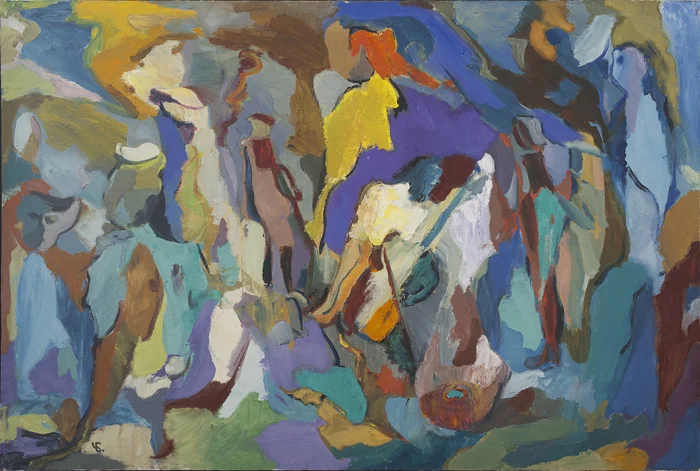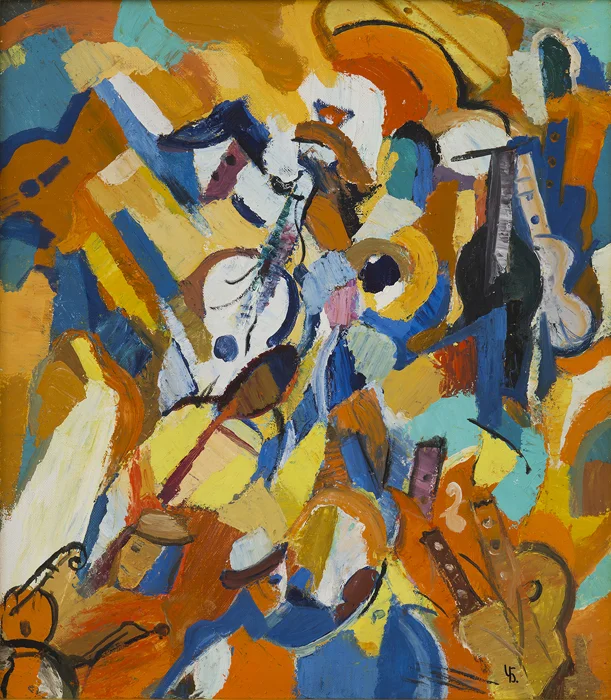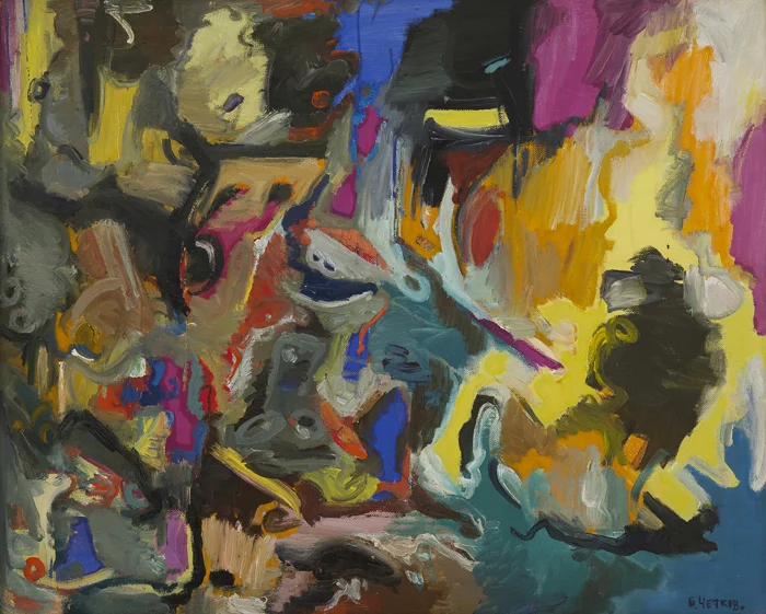 Chetkov had a glorious ability to use all his senses when creating art, and a trope that he returned to again and again is music. Considering his delight in free expression, at this point in his career it is unsurprising there are several celebratory musical works from 1990 including Composition with a Guitar and Concert. These vivid images feature a visual attempt to capture melody on canvas: in Composition with a Guitar the excitable colors bounce and vibrate outwards from the central, just-realized guitar and player, coalescing in places to form additional musicians. Composition with a Guitar is even more abstract: a ‘psychogram’ of music if you will, capturing all the richness of combined instrumental harmony with the faintest suggestion of figures, as if you half-closed your eyes to listen to music. His intense pleasure in painting exudes from both works.