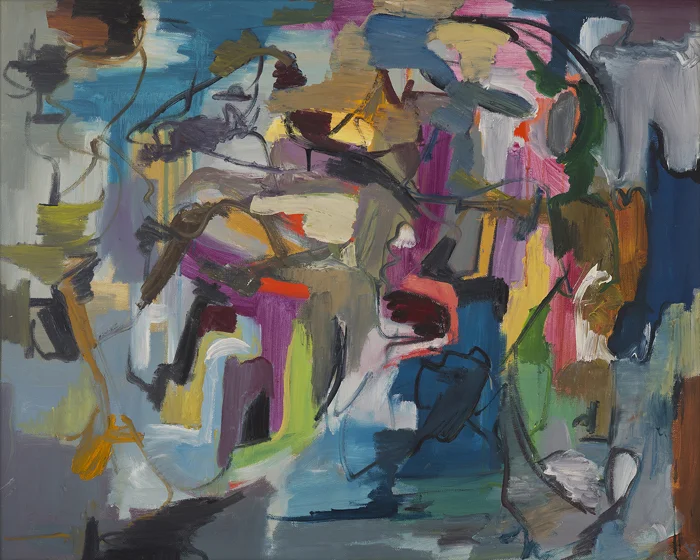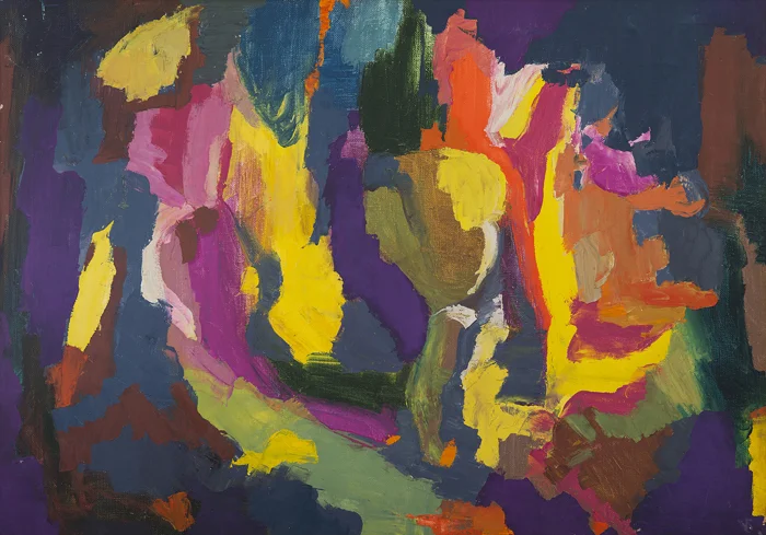 Composition 656, 1990, is a deeply vibrant piece offering a kaleidoscope of color, shading from darker grays and blacks on the left towards pinks and yellows on the right. Swirled and curving brushstrokes in the middle plane of the picture are matched by almost hatch-work on the lower parts and right-hand side. The effect could be jarring but is instead exhilarating – the eye cannot rest, it must take in the colors and shapes. As with all abstract art, it is designed to awake sensation and feeling in the viewer, to make the viewer own the art.